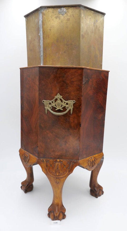 antik englischer Chippendale Jardinire Blumentopf Kupfer Tatzen Nussbaumholz