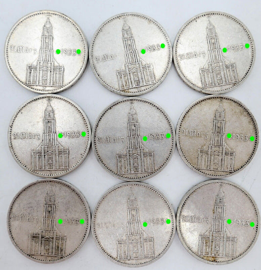 9x 5 Reichsmark 900 Silbermünzen J. 356 Garnisonskirche Datum 1934 aus MünzrolleNormaler Preis €410,00 EURNormaler PreisGrundpreis / pro-