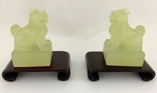 2 alte China vermutlich Glas Löwe Figur auf Holzsockel 8,5 cm ( in Jade Optik )