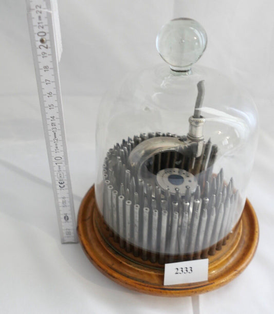 Altes Uhrmacherwerkzeug Triebnietmaschine hinter original Glaskuppel