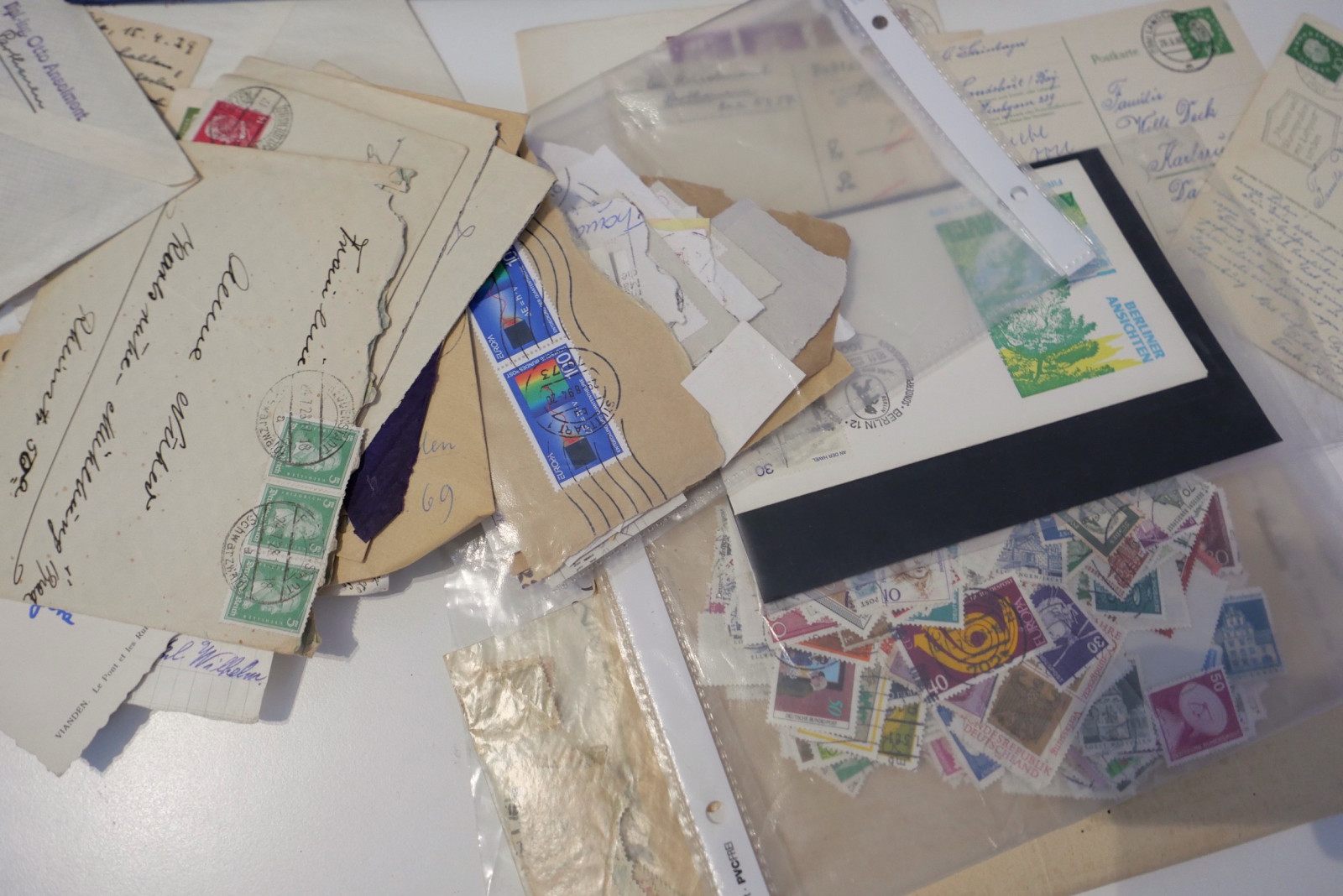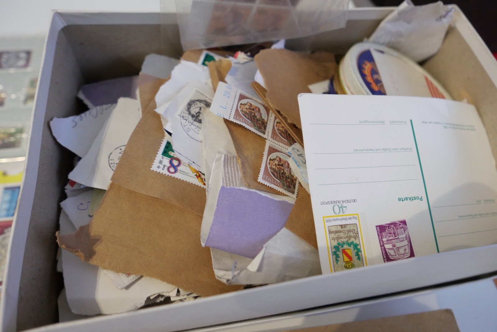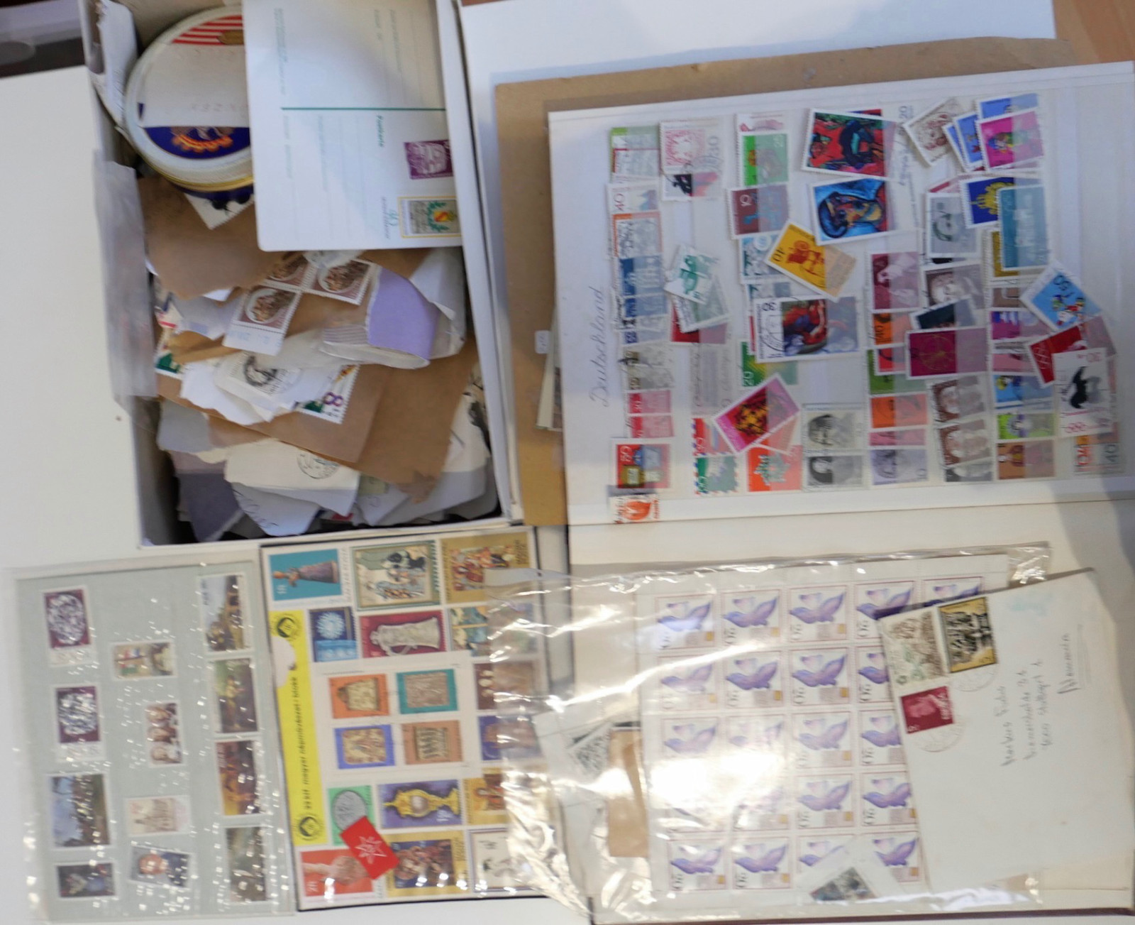 Umfangreicher Briefmarken-Posten bestehend aus mehreren Alben (u.a. Steckbücher), Ersttagsblättern (ETB), Gedenkblättern, Kleinbögen und einer großen Menge loser Ware in Schachteln (Kiloware/Briefstücke).