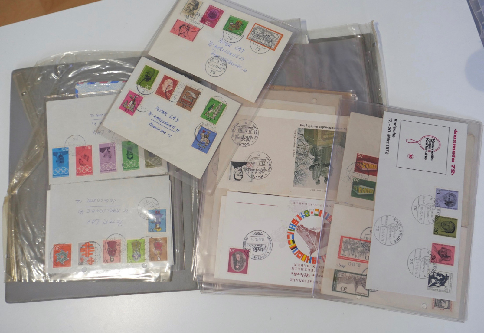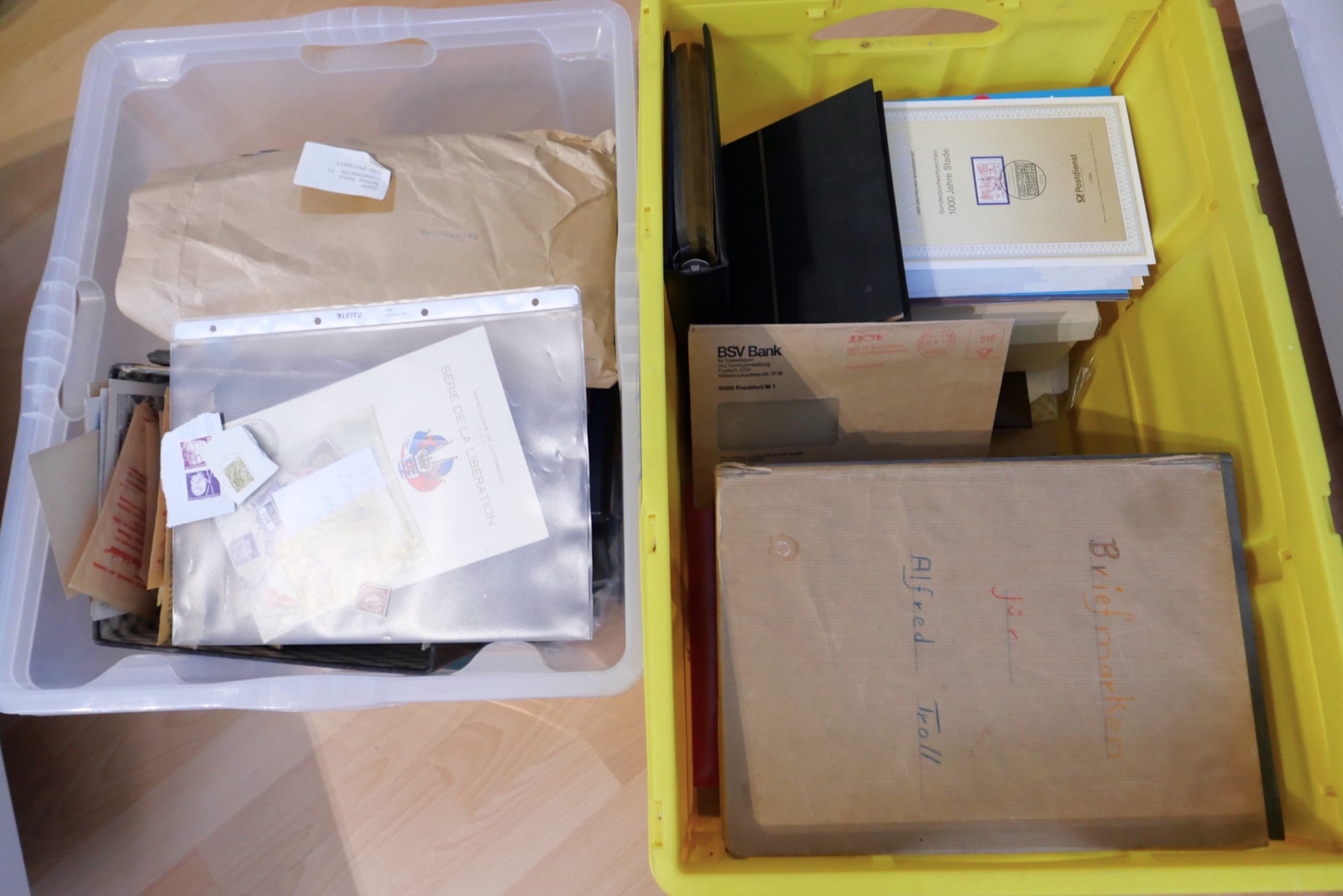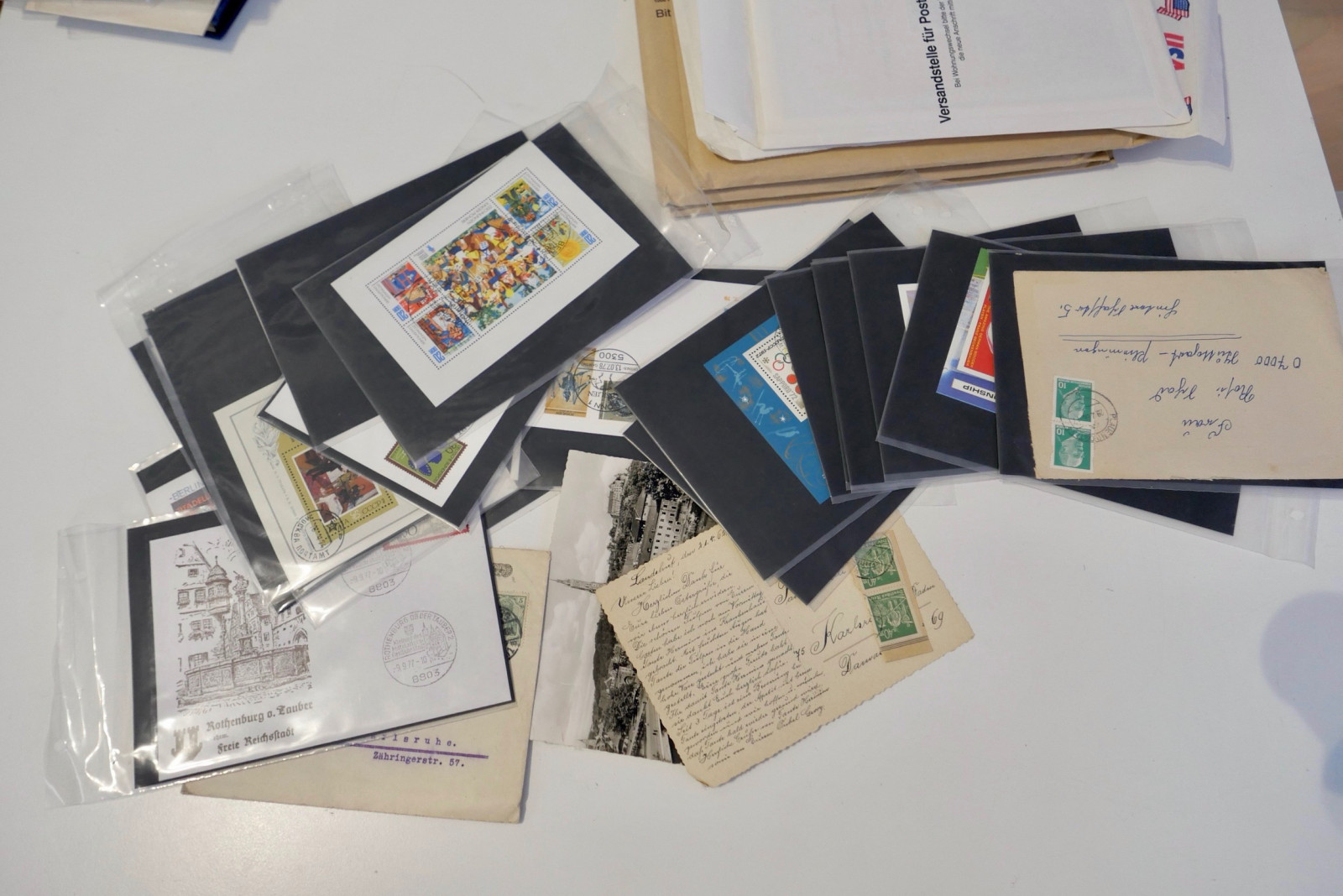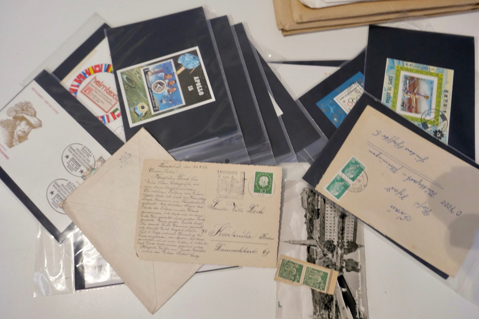 Umfangreicher Briefmarken-Posten bestehend aus mehreren Alben (u.a. Steckbücher), Ersttagsblättern (ETB), Gedenkblättern, Kleinbögen und einer großen Menge loser Ware in Schachteln (Kiloware/Briefstücke).