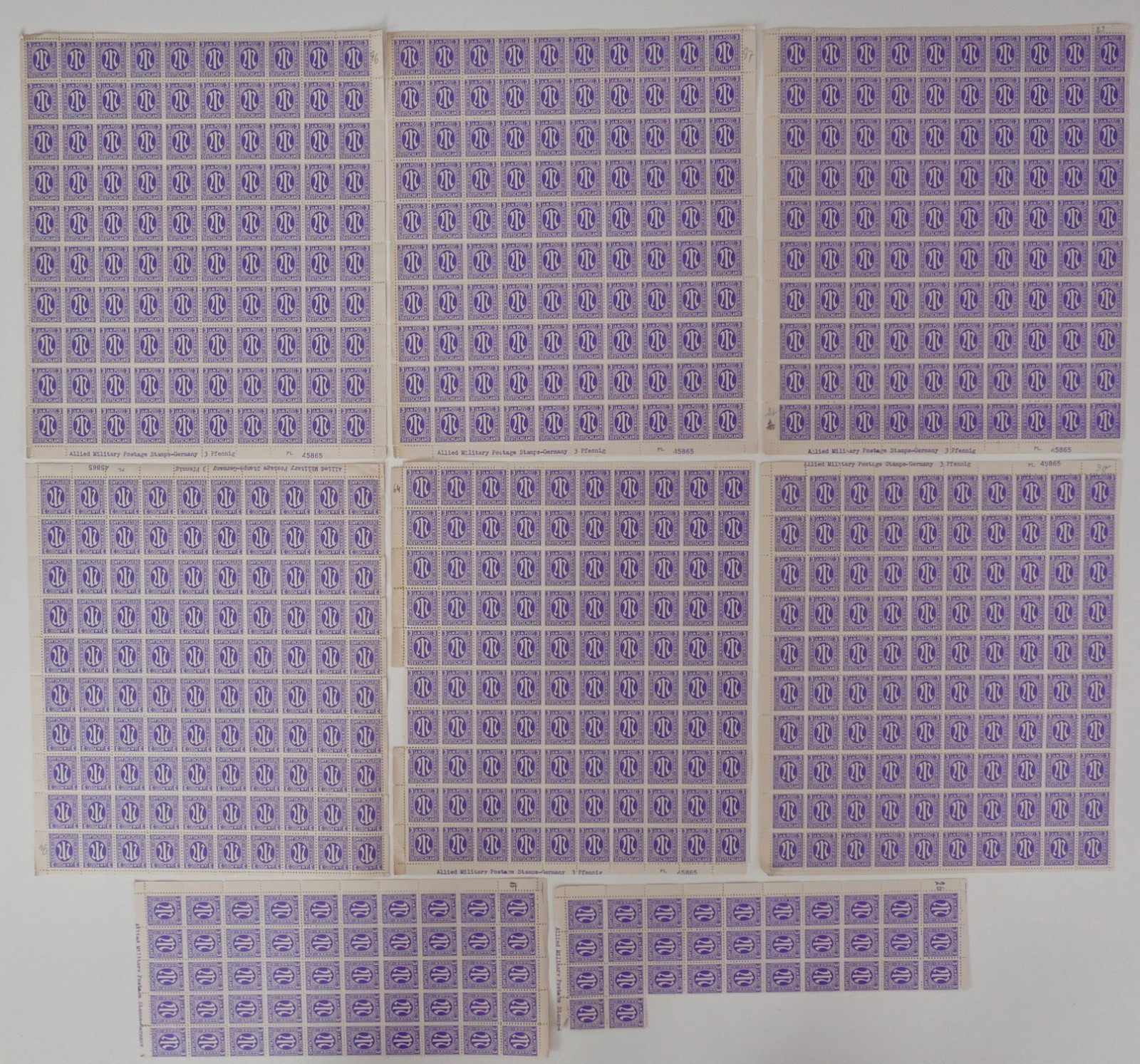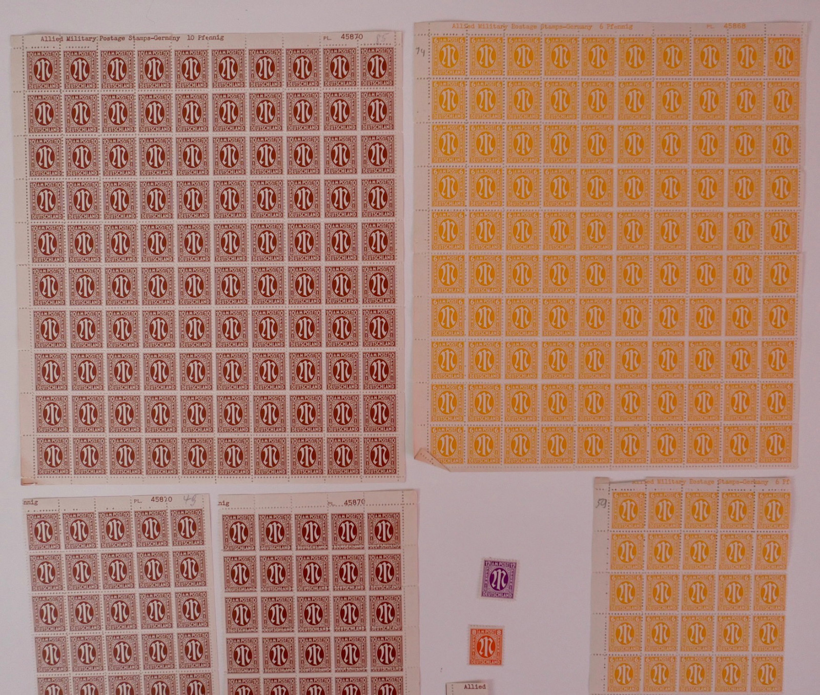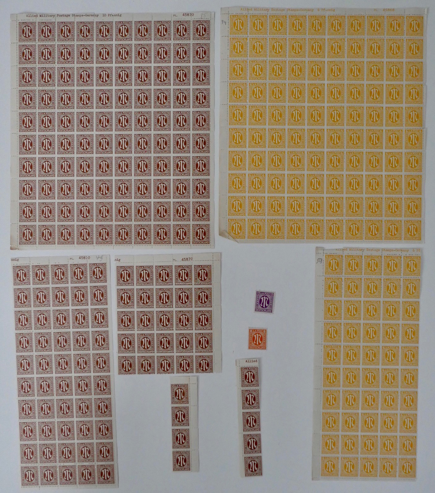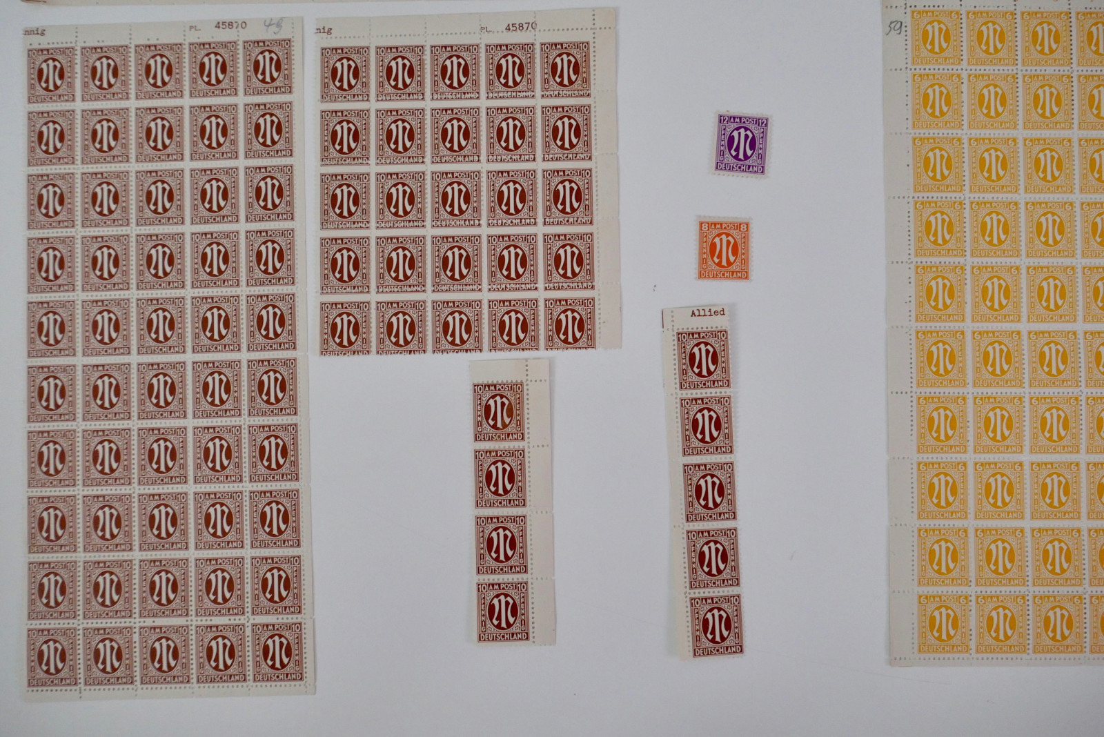 Enthalten sind zahlreiche Bögen und Bogenteile der ersten Ausgaben für die amerikanische und britische Zone.