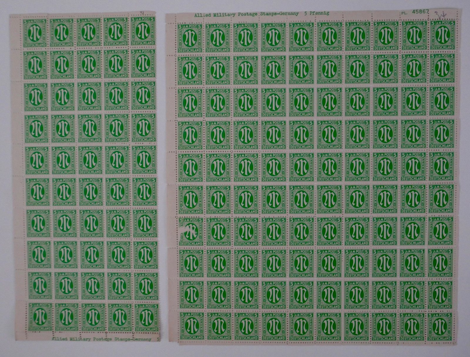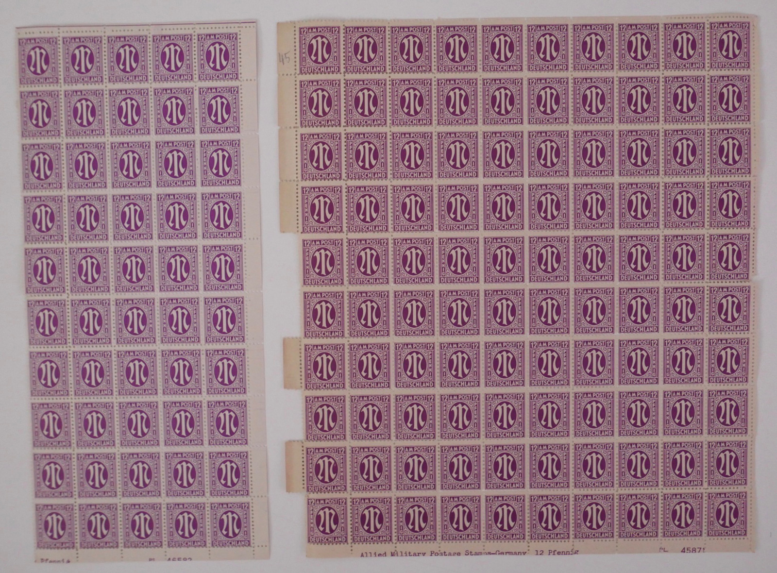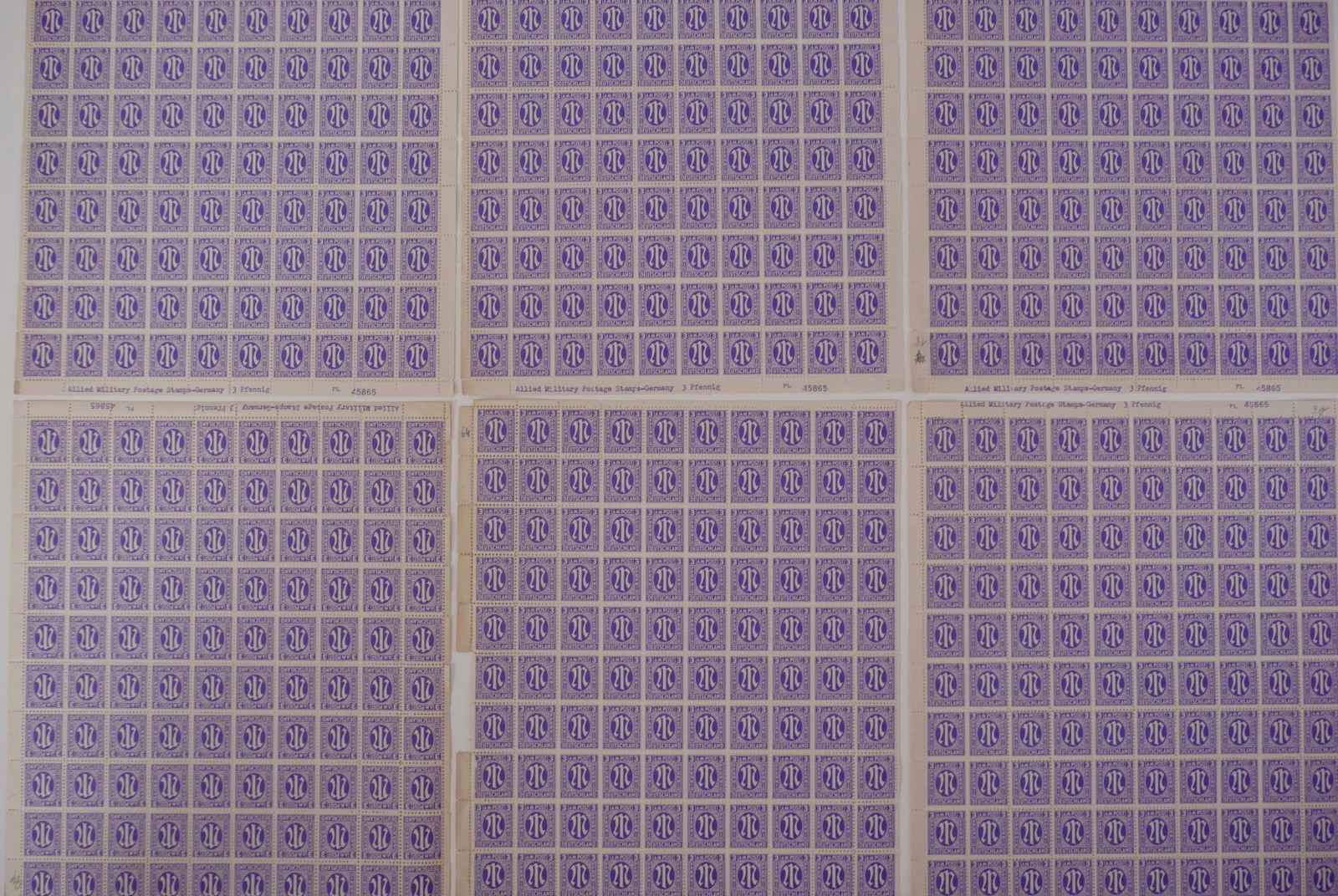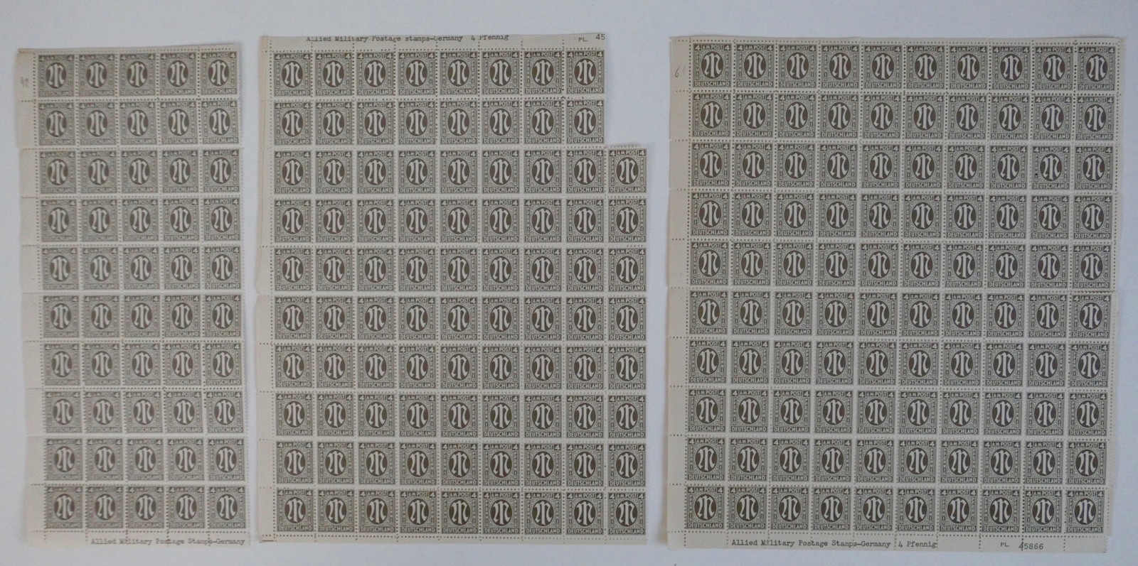 Enthalten sind zahlreiche Bögen und Bogenteile der ersten Ausgaben für die amerikanische und britische Zone.